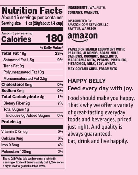 Happy Belly California Walnuts are of the premium Chandler variety, which means they have a large, smooth, and oval shape. Harvested in California’s Central Valley, the Mediterranean-like climate and abundance of rich soil is ideal for growing. We've kept this bag unroasted and unsalted to let the walnuts' rich, sweet flavor stand out. A resealable bag helps ensure maximum freshness, all the way down to the last handful. May contain an occasional nut shell fragment.