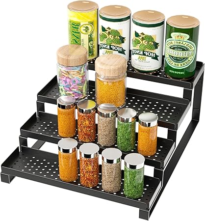 4-Tier Spice Rack Organizer Countertop Racks, Sturdy Seasoning Organizer Spice Storage Metal Riser Shelf, Pantry Kitchen Spice Holder Stand Step Rack Easy See all Canned Spice Jars, Black