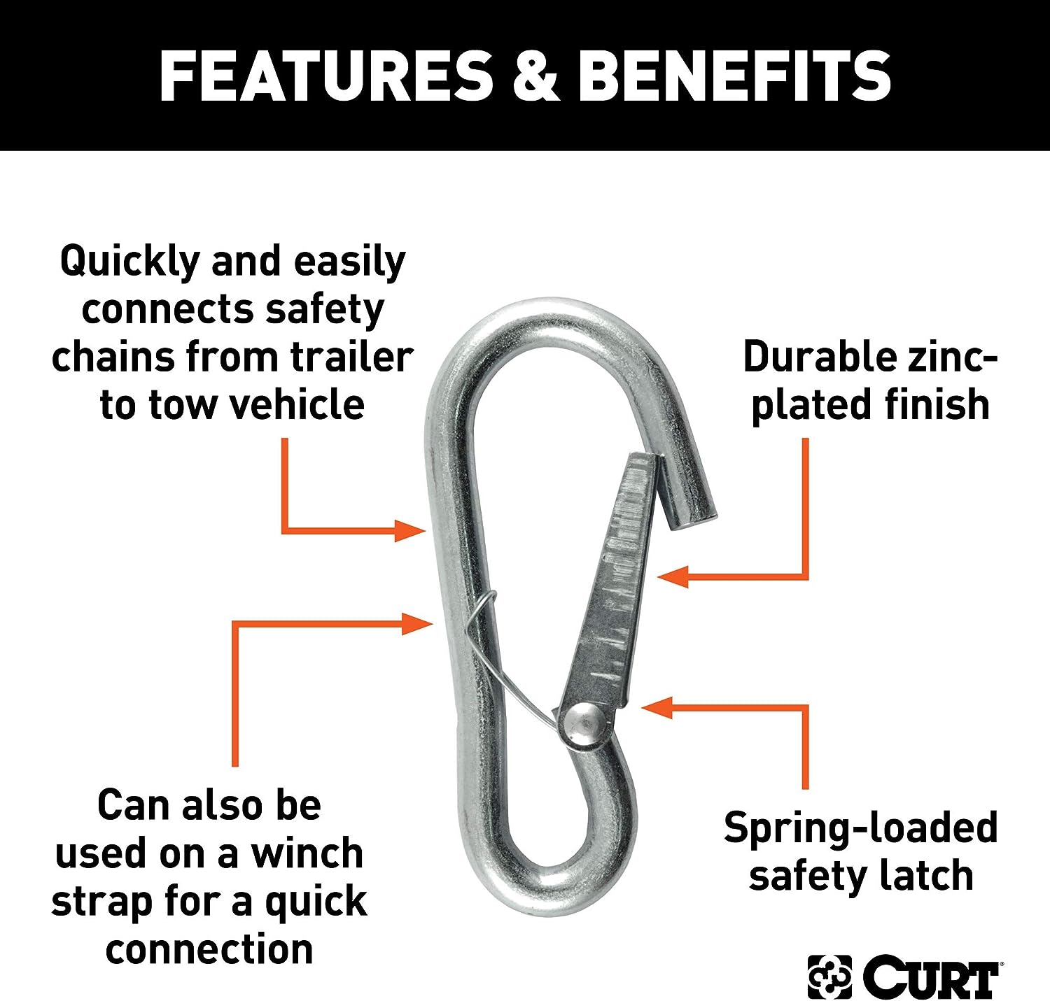 There are always some factors on the road you cannot control -- an irresponsible driver, adverse weather conditions -- but one thing you can control is the type of towing equipment you use. Just because there are threats out there, doesn't mean your towing adventures need to be dangerous. CURT offers a variety of towing safety products -- including safety chains, safety cables, hooks, links and more -- to make sure you have confidence to Bring It and trustworthy equipment to Bring It safely. CURT snap hooks are a highly secure way to connect your safety chains from your trailer to your tow vehicle. They feature a spring-loaded safety latch that turns the hook into a closed loop. Similar to a quick link, the safety latch allows for a safety chain connection that won't come loose from vehicle vibrations or jarring on uneven terrain. Snap hooks also feature a strong steel construction and come with a zinc-plated finish to outlast the elements. This particular snap hook has a 3/8" diameter and offers a gross trailer weight capacity of 2,000 lbs. Remember, when attaching safety chains, the chains should be cross underneath the trailer coupler, and each hook and chain must be rated to meet or exceed the gross weight of the trailer.