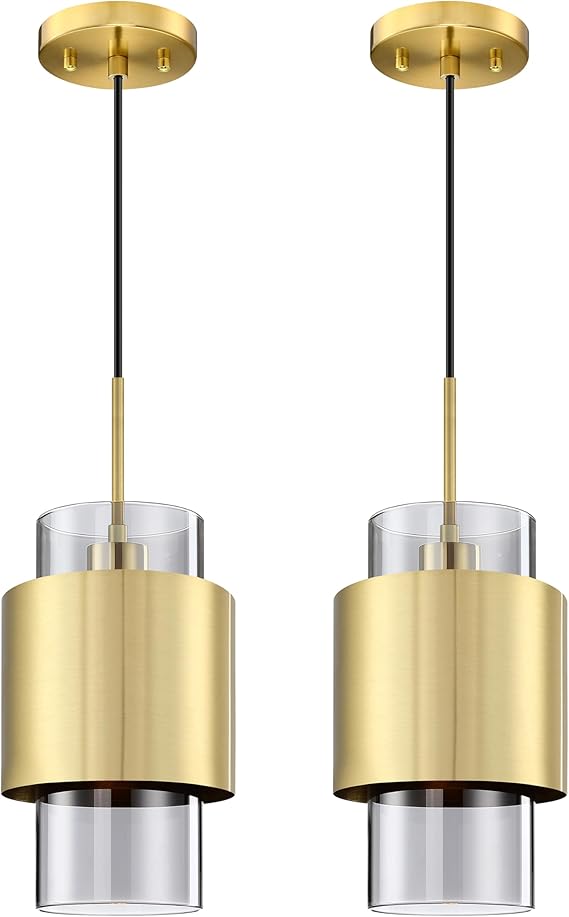 1 Light Hanging Indoor Kitchen Island Pendant Ceiling Light 6" Drum Glass Shade Fixture, Modern Farmhouse Dinning Room Over Sink (Brushed Bronze Finish Grey Glass, 2 Pack)