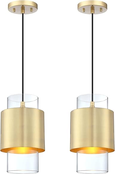 1 Light Hanging Indoor Kitchen Island Pendant Light 6" Drum Glass Shade Pendant Ceiling Light Fixtures Modern Farmhouse Dinning Over Sink (Gold Finish, 2 Pack)