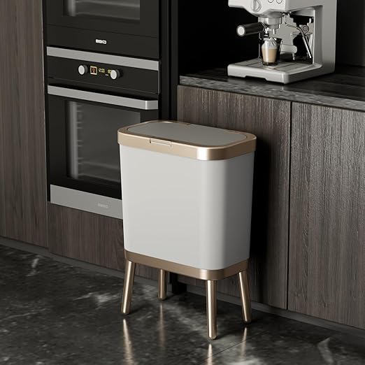 4 Gallon Kitchen Trash Can with Lid, 15L White Garbage Can with Gold Edge, Small Narrow Waste Basket with Push Button, Plastic Modern Trash Bin Dog Proof for Bathroom, Office, Bedroom, Living Room