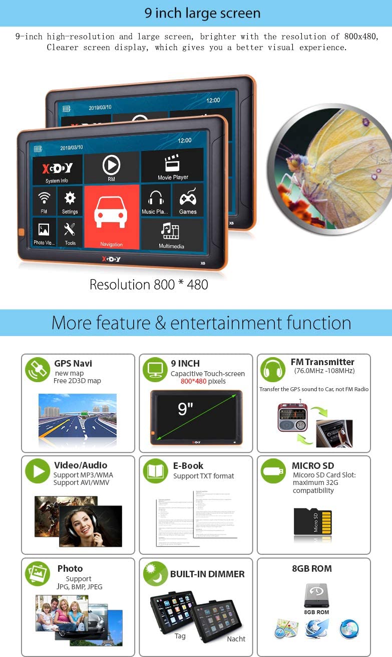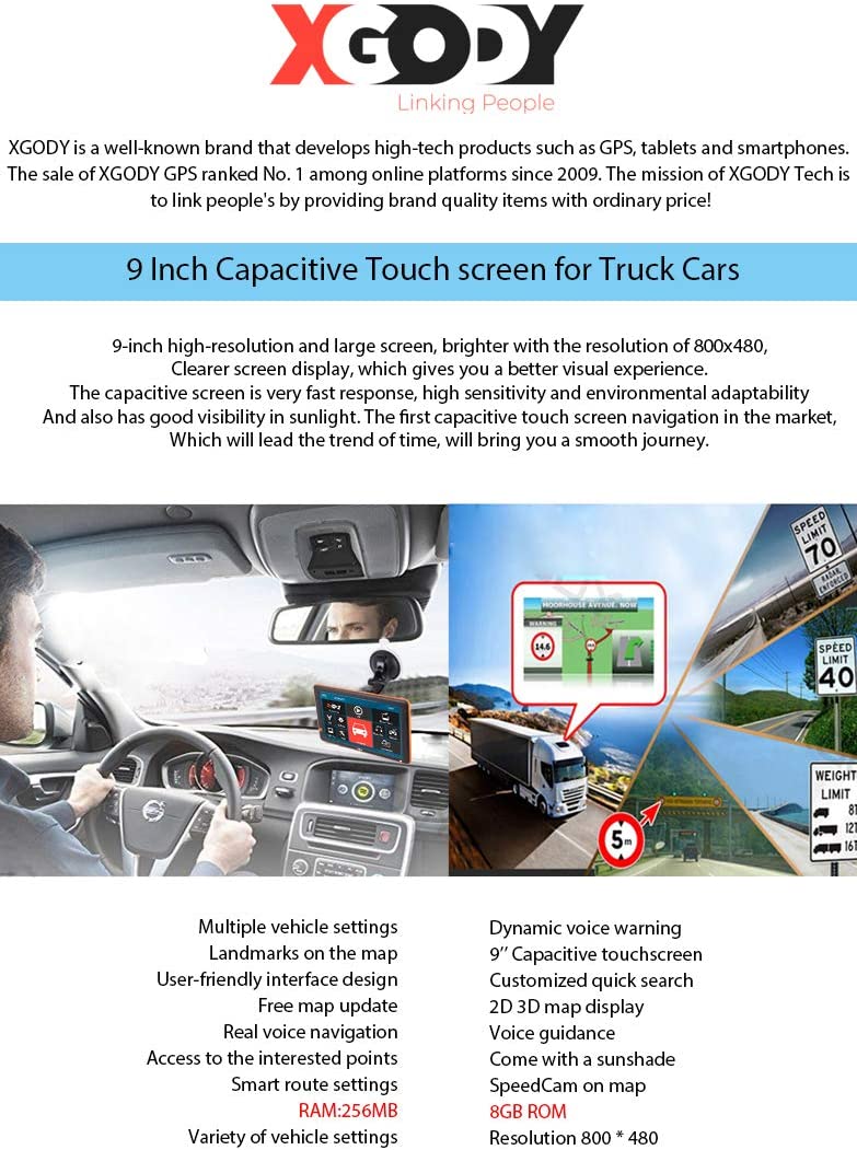 • ★【9 INCH BIG SCREEN FOR TRUCK】XGODY X5 gps navigation brings 9-inch high-resolution and large screen, brighter with the resolution of 800x480, Clearer screen display, which gives you a better visual experience. You can customize a better route according to your vehicle’s weight, length, height and width, thus avoiding the roads which have width restrictions or height restriction or weight restriction, etc.