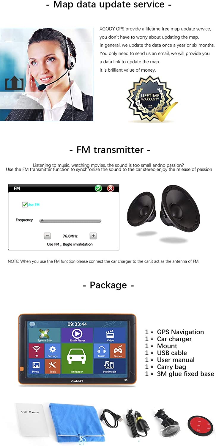 • ★【FREE LIFETIME MAPS 】XGODY X5 Vehicle GPS Satellite Navigator comes with 2D/3D All America maps, including Argentina, Brazil, Canada, Chile, Colombia, Costa Rica, Mexico, United States. If you wanna update maps or maps of other country, please be free to email us via amazon.