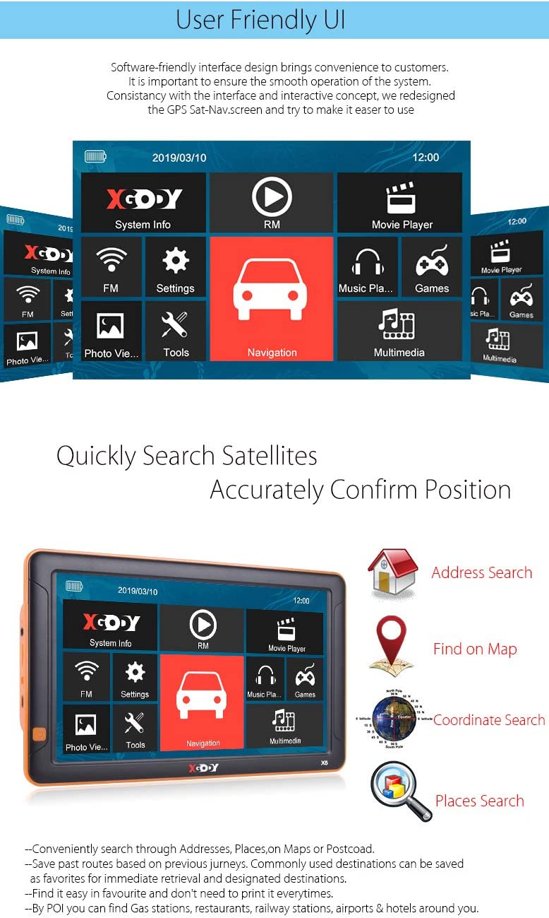 • ★【NEW SERIES & UPGRADED UI】XGODY X5 Car GPS comes with special design by Italian designer for 4 months, this new series brings the upgraded UI , which is easy to use and practicable with humanization design.