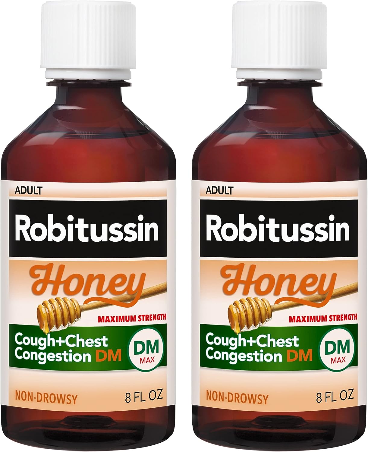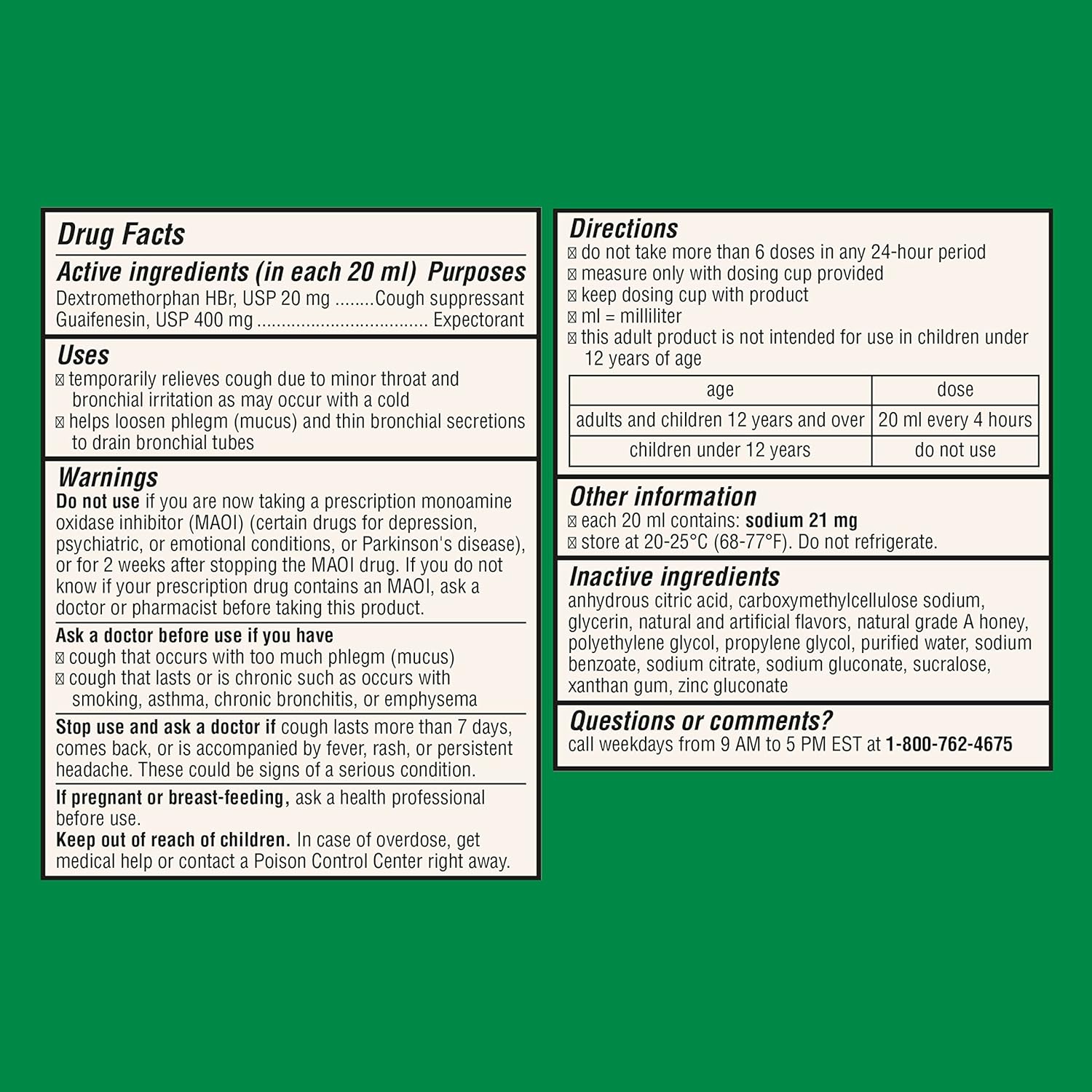 Robitussin Maximum Strength Honey Cough Plus Chest Congestion DM is cough medicine for adults that uses real honey for taste, along with a cough suppressant and expectorant to relieve coughs and clear mucus so your voice can be heard. With 19.2 percent real, grade A True Source Certified Honey in each dose, this liquid expectorant and cough suppressant is gluten free and contains no artificial colors. Adults and children 12 years and older may take 20 mL of this Robitussin cough and congestion medicine every 4 hours. Each dose of Robitussin Honey DM Max cough syrup soothes on contact while controlling coughs, providing chest congestion relief and thinning and loosening mucus for hours. Formulated to relieve symptoms while letting you get on with your day, Robitussin Honey DM Max cough syrup is non-drowsy and easy to measure and administer. Delivering cough relief for more than 70 years, Robitussin has the product you need to treat your specific cough, cold, sore throat or flu symptoms for day and night relief.