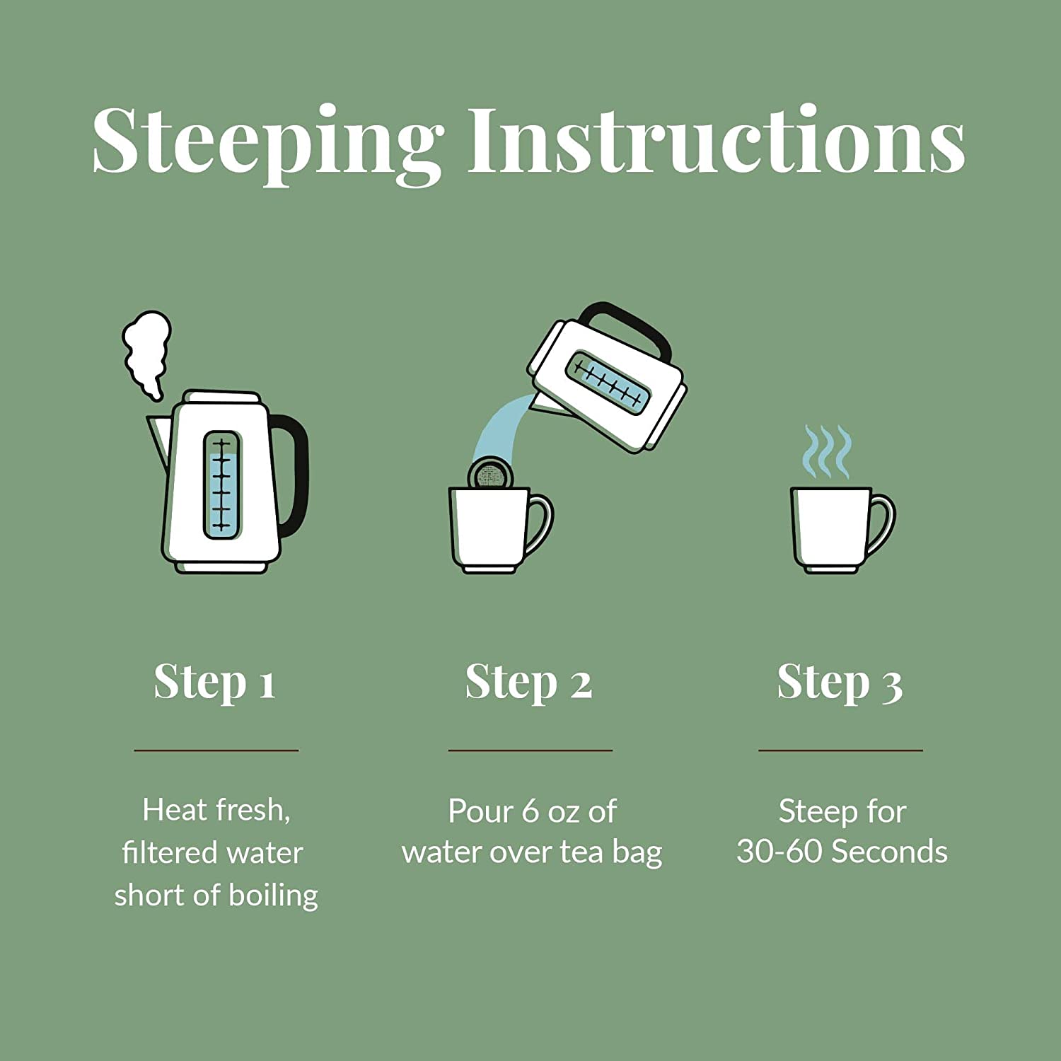 • STEEPING INSTRUCTIONS: Simply heat fresh, filtered water to just short of boiling. Then pour 6 oz water over tea and steep for 30-60 seconds.