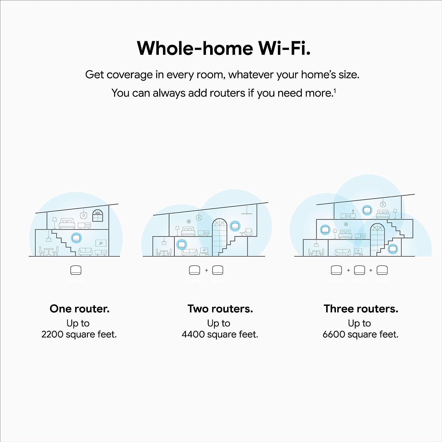 [1] Home size, materials, and layout can affect how Wi-Fi signal travels. Larger homes or homes with thicker walls or long, narrow layouts may need extra Nest Wifi devices for full coverage. Strength and speed of signal will depend on your internet provider. [2] This is based on only using connected devices at a maximum data rate of 1Mbps. Requires sufficient broadband internet connection and connected devices must be located within Wi-Fi coverage area. [3] Strength and speed of signal will depend on your internet provider. [4] Controlling certain devices and features in your home requires a compatible smart device. The Wifi point is optimized for selected content services only.