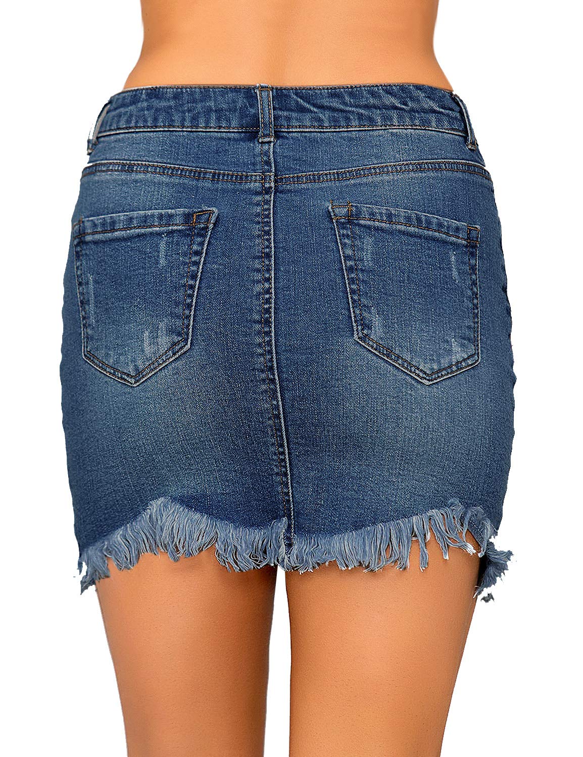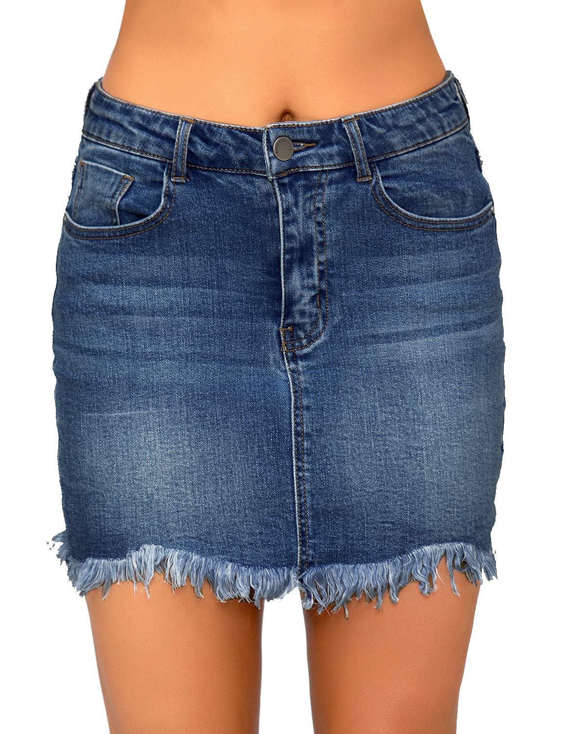 Details: Item Specific: Women's short jean skirt comes with mid rise and above knee length. Stretchable washed material with whiskering details. Casual five pockets and button-and-zipper closure. Frayed raw hem. Skinny denim skirt features fringed design. Care Instruction: Gentle machine wash separately. Occasion: casual, daily life, street style, dating, going out, night out, travel, vacation, holiday, etc. Measurement: Size Small (fits US 4–US 6): fits Waist 25"-27"; Hips 35.5"-37.5" Size Medium (fits US 8–US 10): fits Waist 27"-29"; Hips 37.5"-39.5" Size Large (fits US 12–US 14): fits Waist 30"-32"; Hips 40.5"-42.5" Size X-Large (fits US 16–US 18): fits Waist 33"-35"; Hips 43.5"-45.5" Size XX-Large (fits US 20-US 22): fits Waist 36"-39", Hips 46.5"-48.5".Model Stats: Height: 5'9" Waist: 25" / Hips: 36.5" Model is wearing size Small.