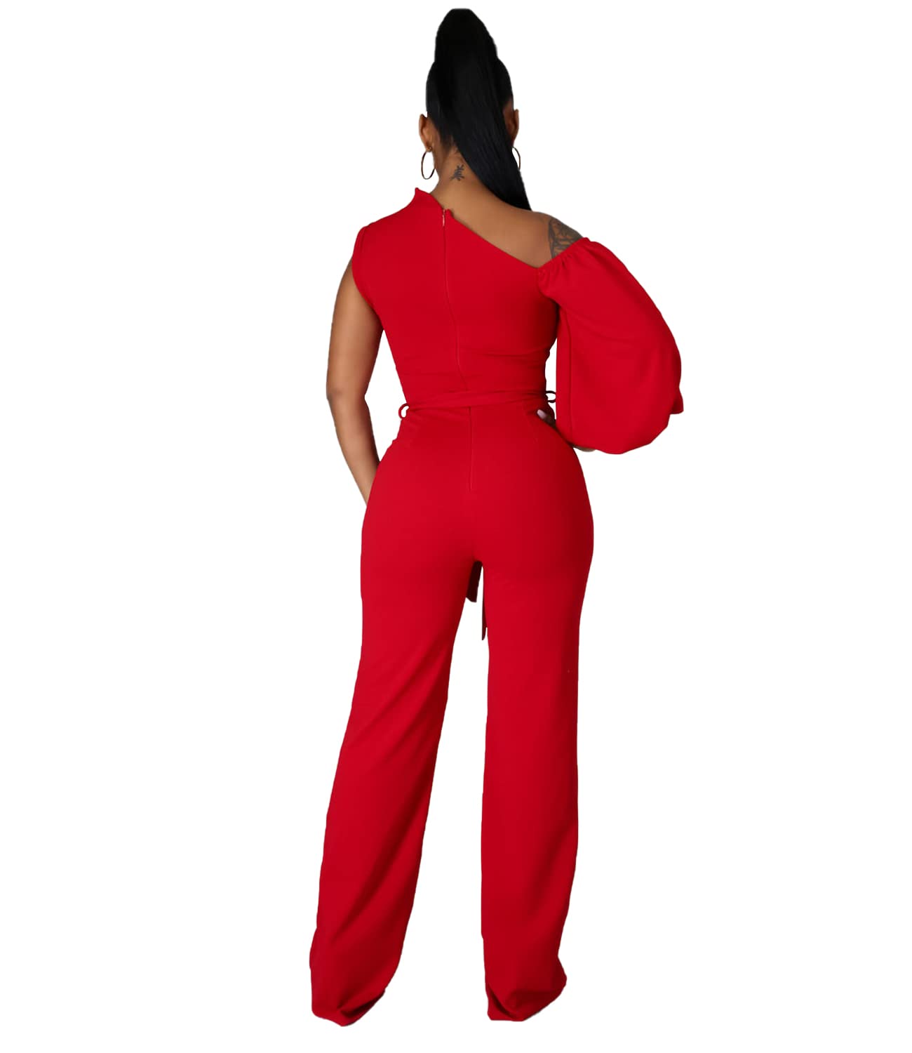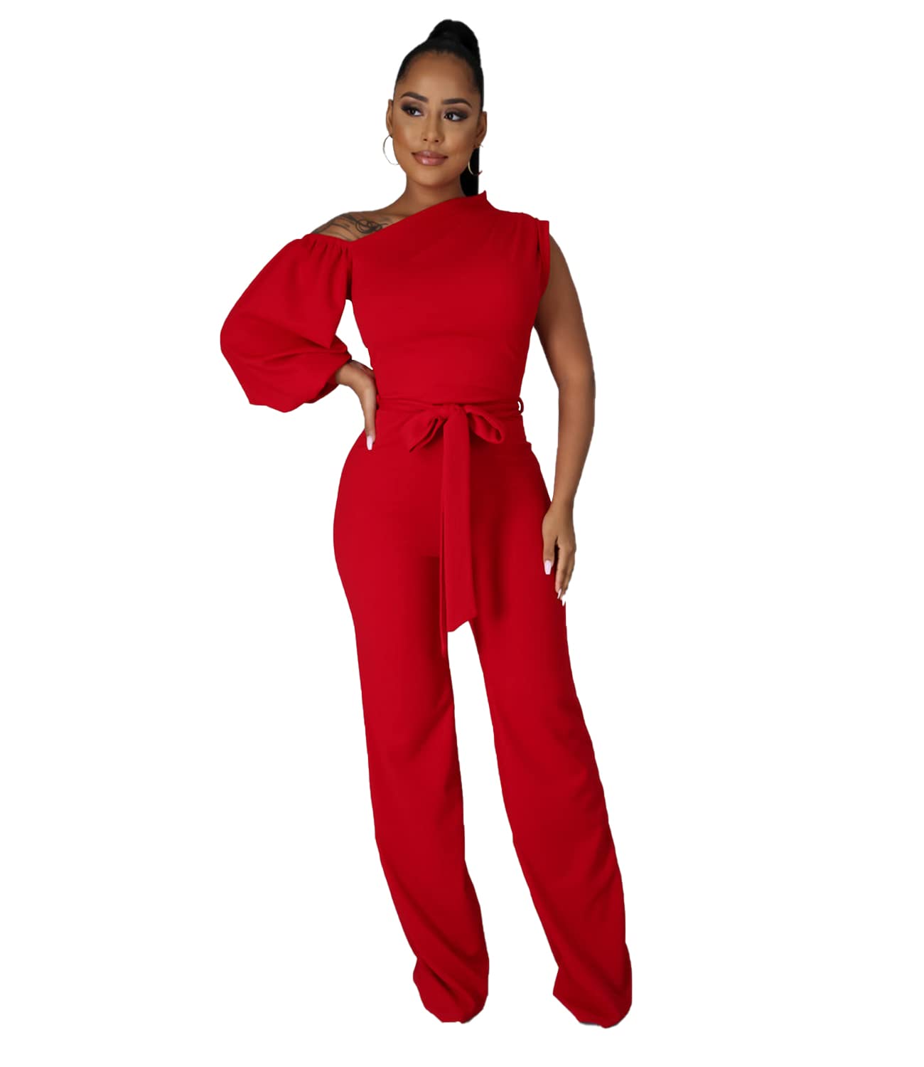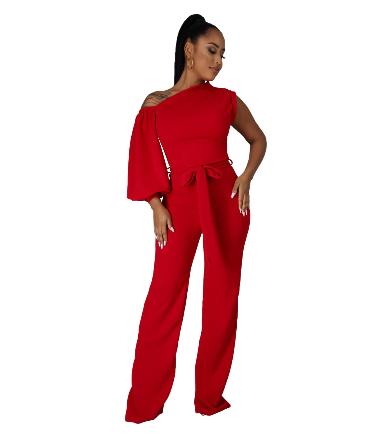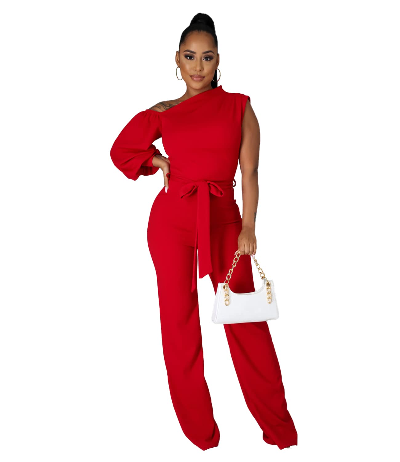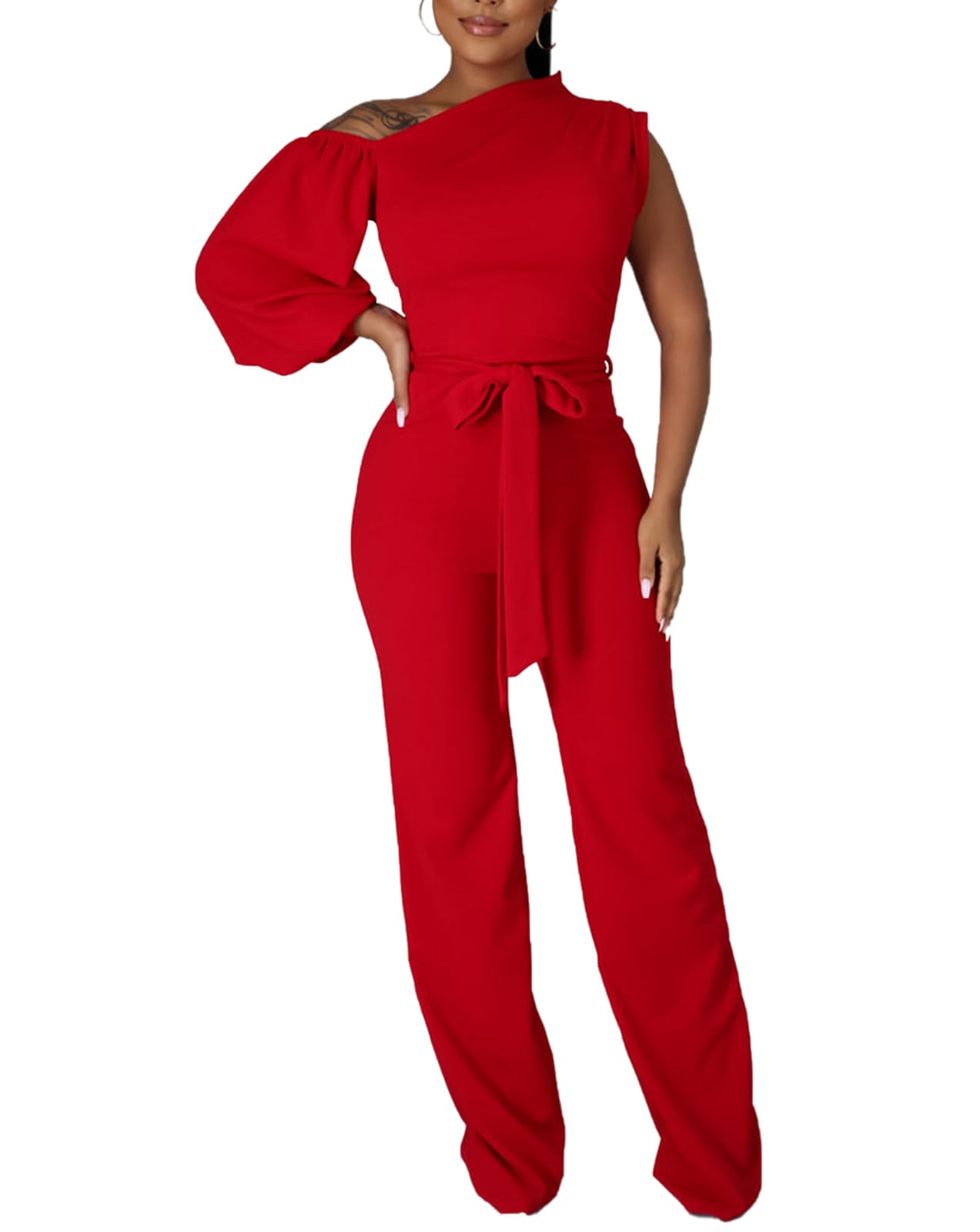 • Elegant Sexy Solid Color Slanted Shoulder High Waist Belted Club Party Cocktail Jumpsuit