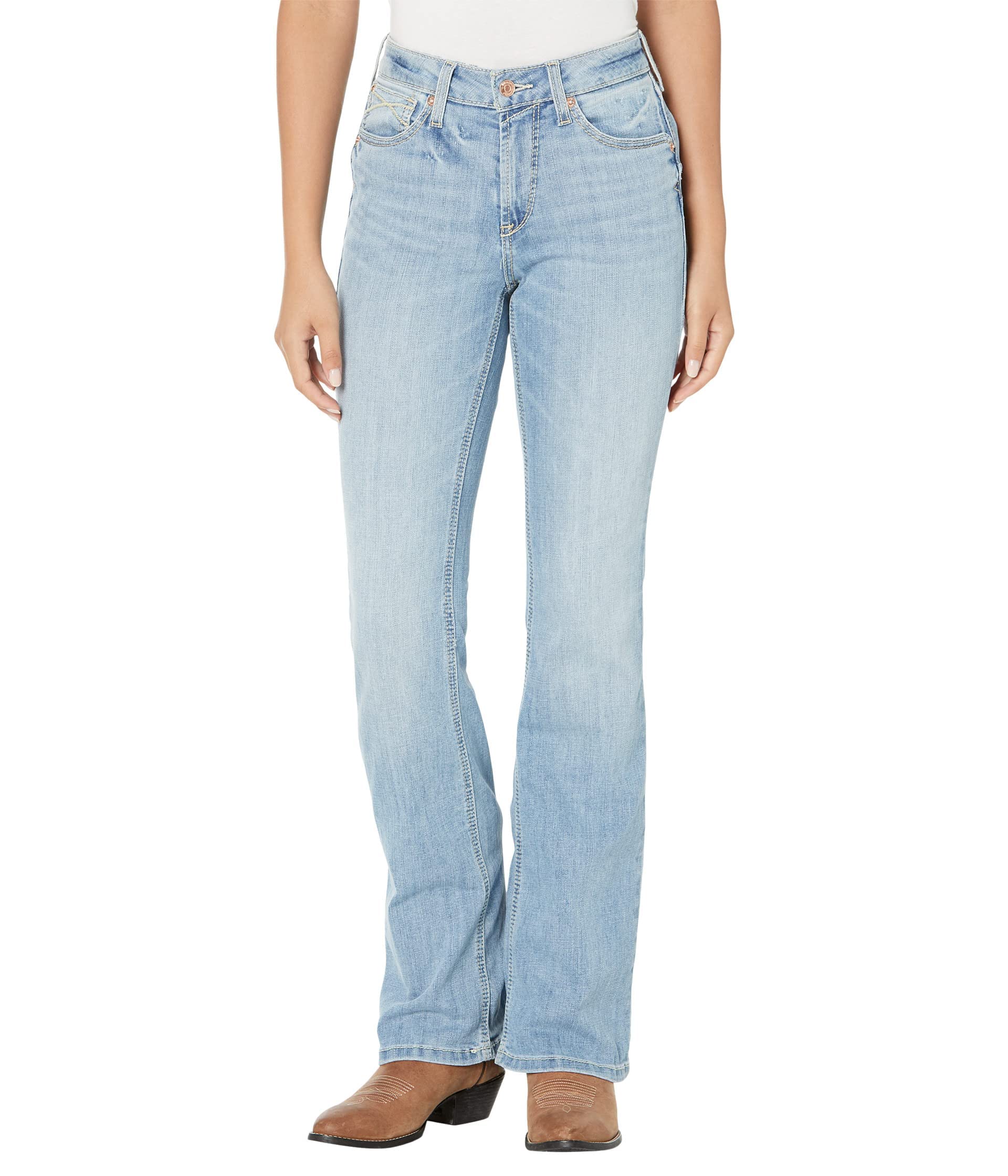 Details: Upgrade your modern closet with classic silhouettes by adding Ariat R.E.A.L. High-Rise Felicity Bootcut Jeans. High-rise, bootcut fit. Zip-fly and button closure. Classic five-pocket design. Contrast stitch lines on the back pockets. 95% cotton, 4% elasterell-P, 1% Lycra spandex. Machine washable.