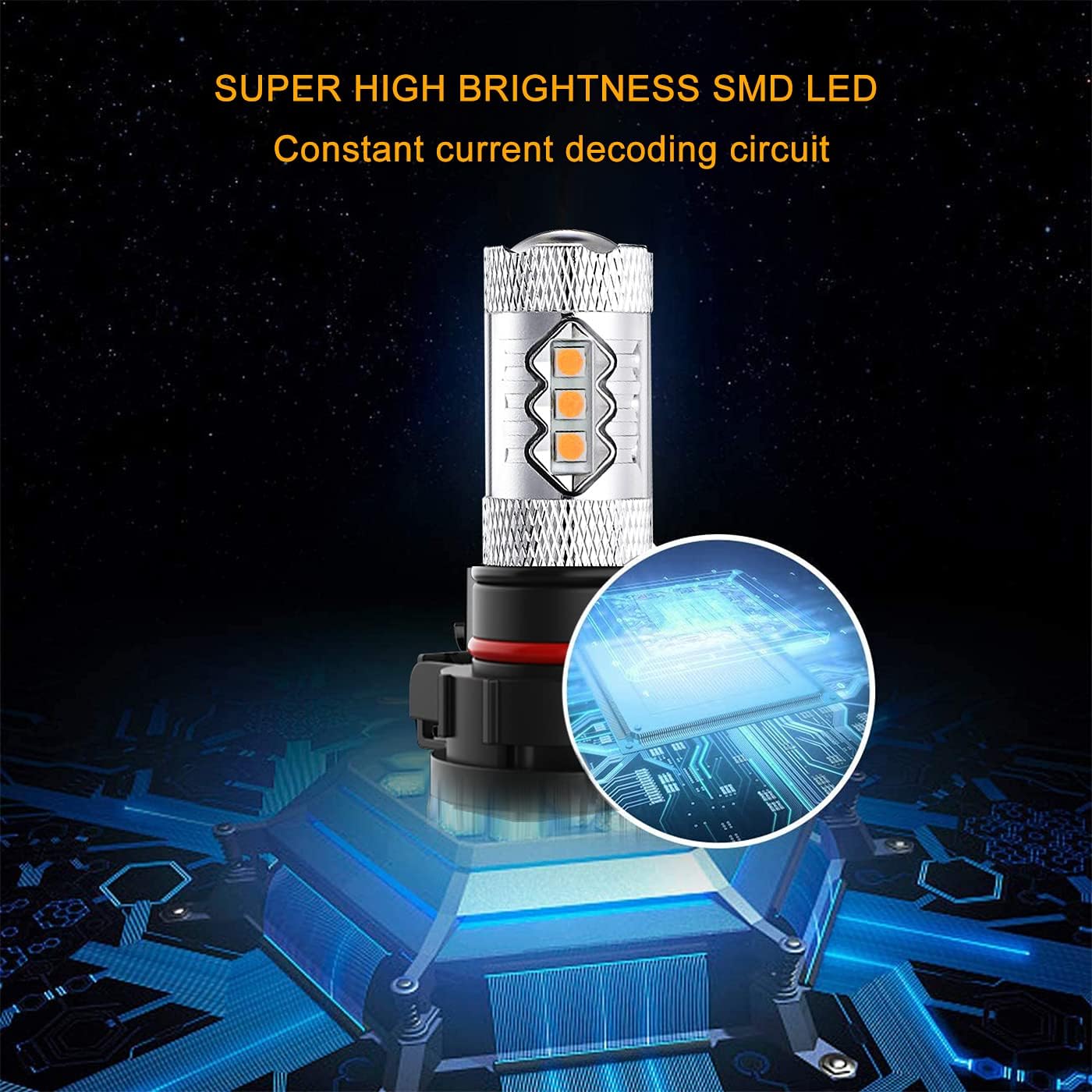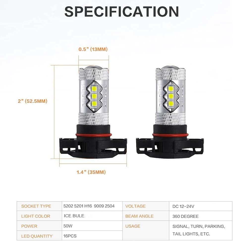 • Scocket Type: 5202 5201 H16 PSX24W 9009 2504. Lighting Color :White Color. Working Voltage: 12V - 24V. Size: 52.5 x 35 x 13mm/ 2" x 1.4" x 0.5"(L*W*H). Beam Angle:360°. It is a good choice for someone need better light output.