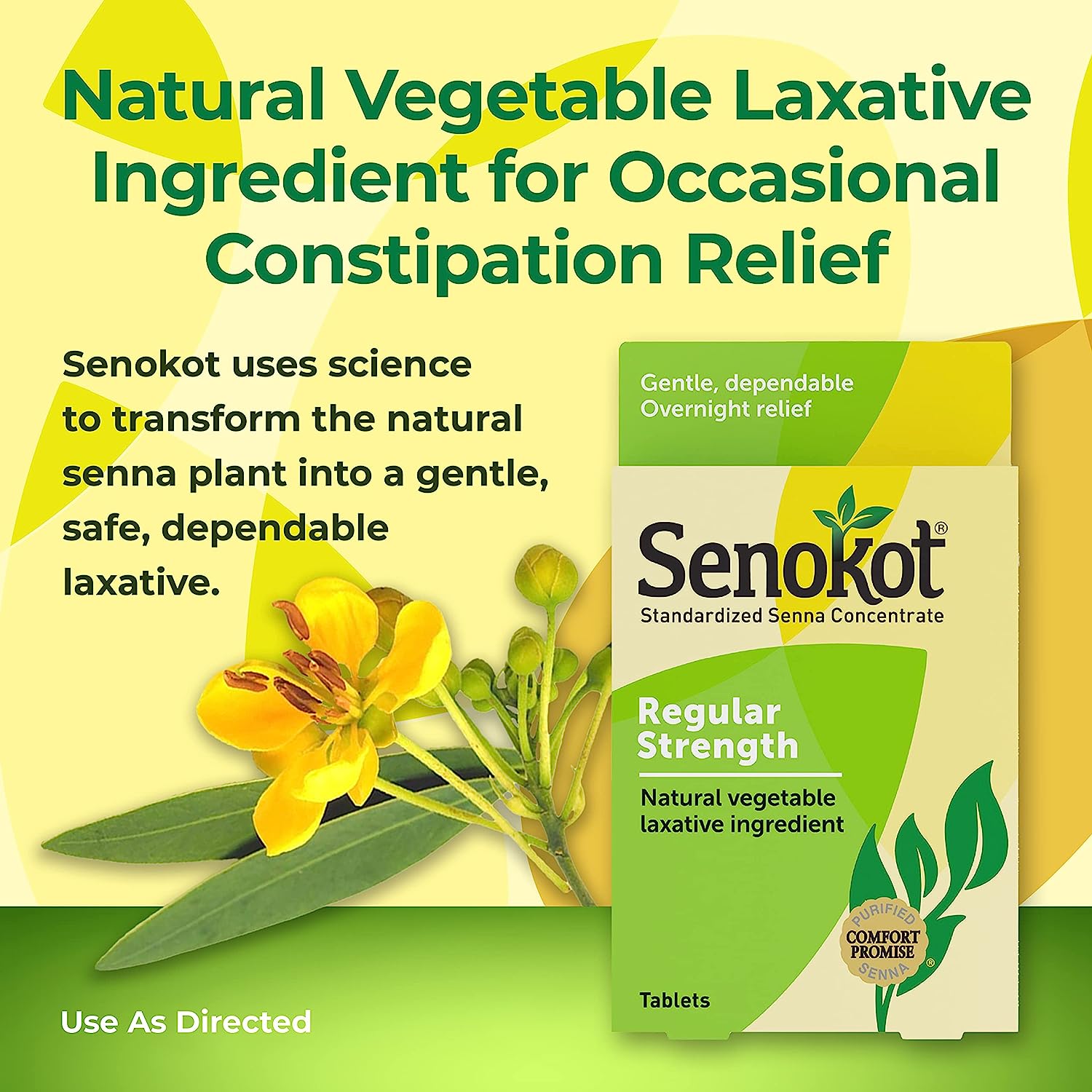 • CLINICALLY PROVEN. Senokot Regular Strength Laxative Tablets provide gentle, overnight relief from occasional constipation using a natural vegetable laxative ingredients. Use for treating occasional constipation associated with stress or dietary changes.