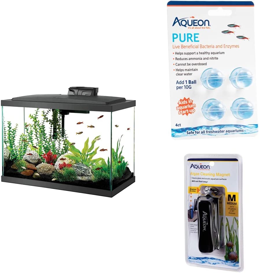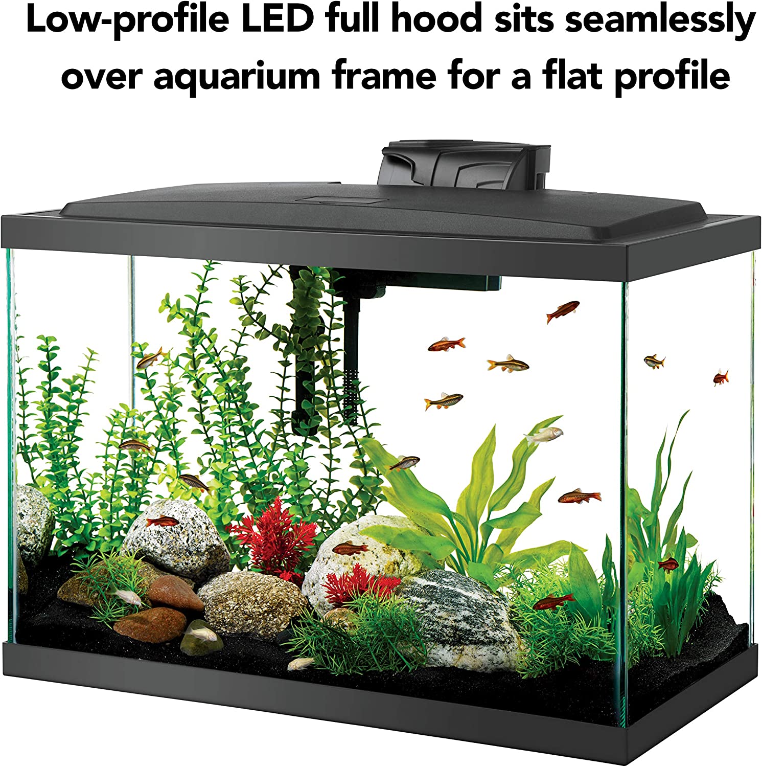 Aqueon LED boxed fish tank kits offer a complete habitat with vibrant LED lighting to bring the aquarium to life. The energy saving low-profile hood features cool white LEDs for total illumination, a convenient feeding door in the front and breakout sections in the back for popular accessories. Complete with high-quality components needed for a healthy aquatic environment including a heater, QuietFlow LED PRO power filter, fish food, water conditioner, fish net and a stick-on thermometer. A complete guide is also included to walk you through the process of proper aquarium setup. The Aqueon QuietFlow LED PRO filter will make maintenance super easy. It’s patent pending LED on the top of the filter will start flashing when it's time to change the cartridge - no more guessing! In addition, the enhanced five-stage filtration and included ammonia specialty filter pad will help keep your aquarium water clean and your fish healthy. Aquarium is made in the USA and measures 20-1/4" x 10-1/2" x 12-9/16". Fish, gravel and décor are sold separately.
