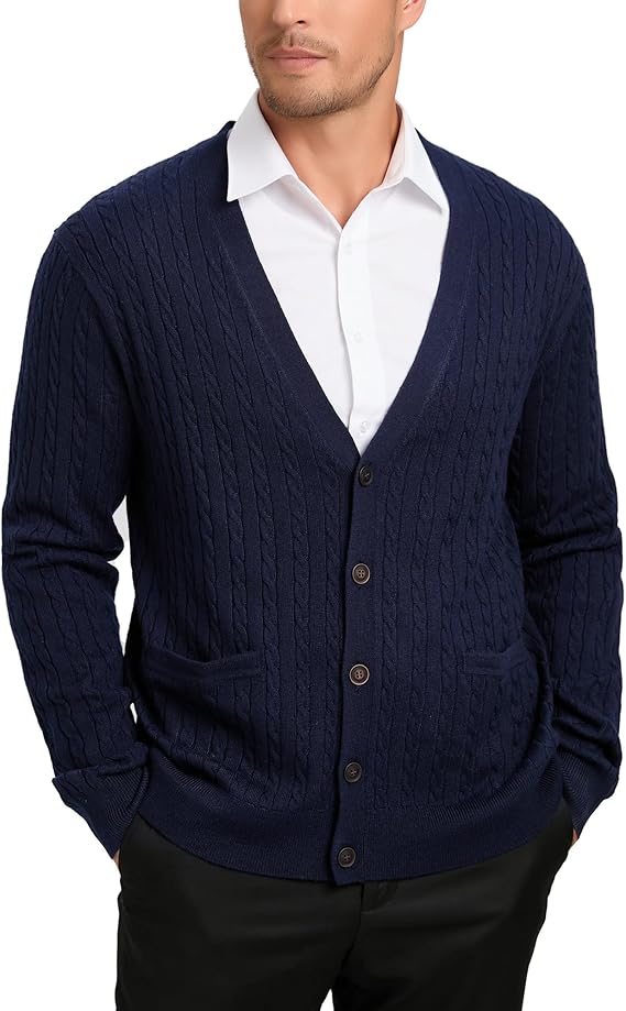 Kallspin Men's Cardigan Sweater Wool Blend Cable Knit V Neck Buttons Cardigan with Pockets