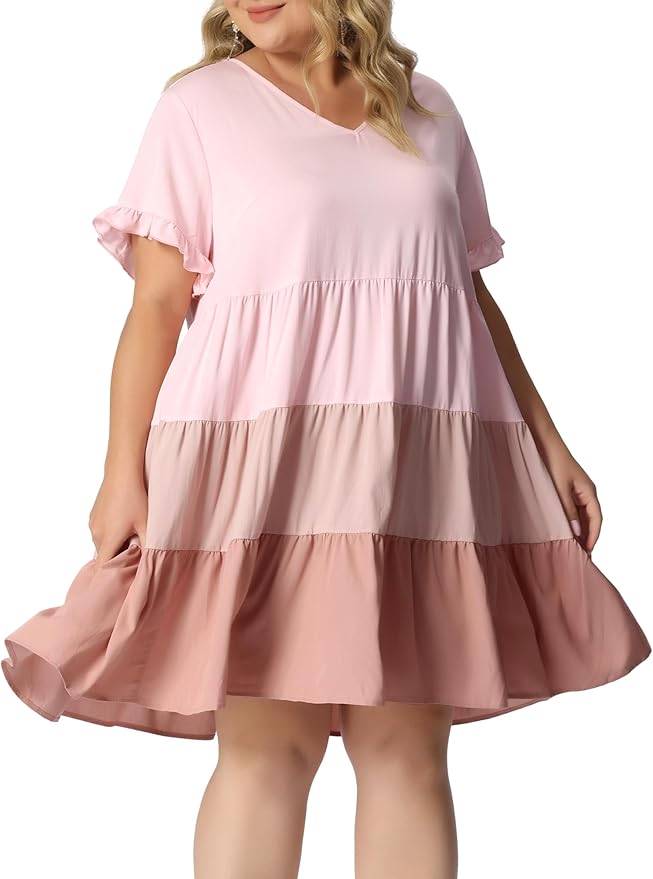 Agnes Orinda Women's Plus Size Babydoll Ruffle Short Sleeve Casual Loose Flowy Swing Hem Chambray V Neck Mini Dress