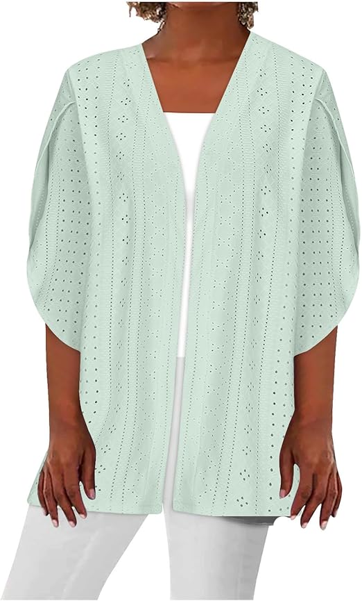 Women's Eyelet Lace Cardigans Fall Cover Up Lightweight 3/4 Sleeve Shirts Cardigan Vacation Wear Casual Tops