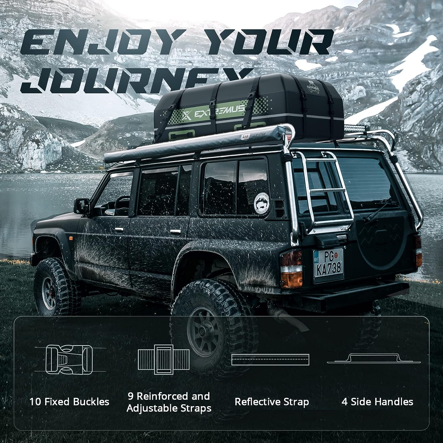 • πŸš—More Security: To ensure your belongs are always safe and secure, the Extremus ExplorationX carrier bag is specially equipped with 9 reinforced and adjustable straps with 10 fixed buckles to firmly hold the cargo bag in place. In addition, the carrier bag is also equipped with an anti-slip, roof protection mat and 6 door hooks to keep the bag steady at high speeds and in extreme weather.