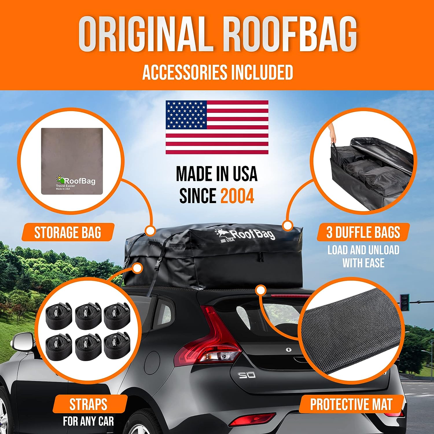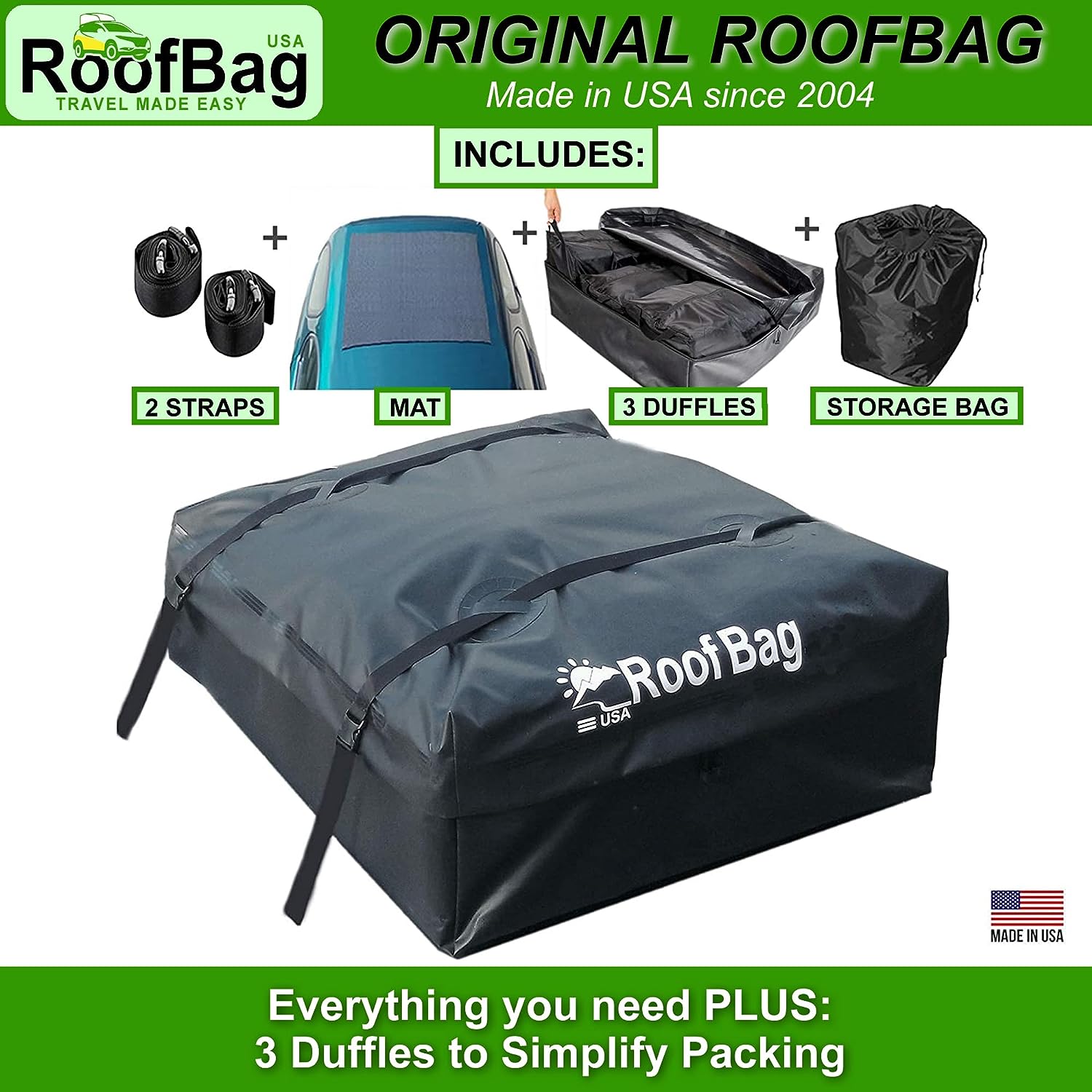 RoofBag Car Rooftop Cargo Carrier 13 Cubic, Waterproof Roof Bag Top Luggage Storage Carriers for Any Car with/ Without Rack Cross Bar Including Anti-Slip Mat + 8 Strong Nylon Straps + Storage Bag + 3 Duffle Bags