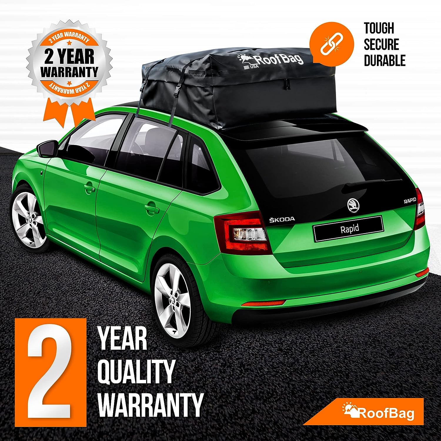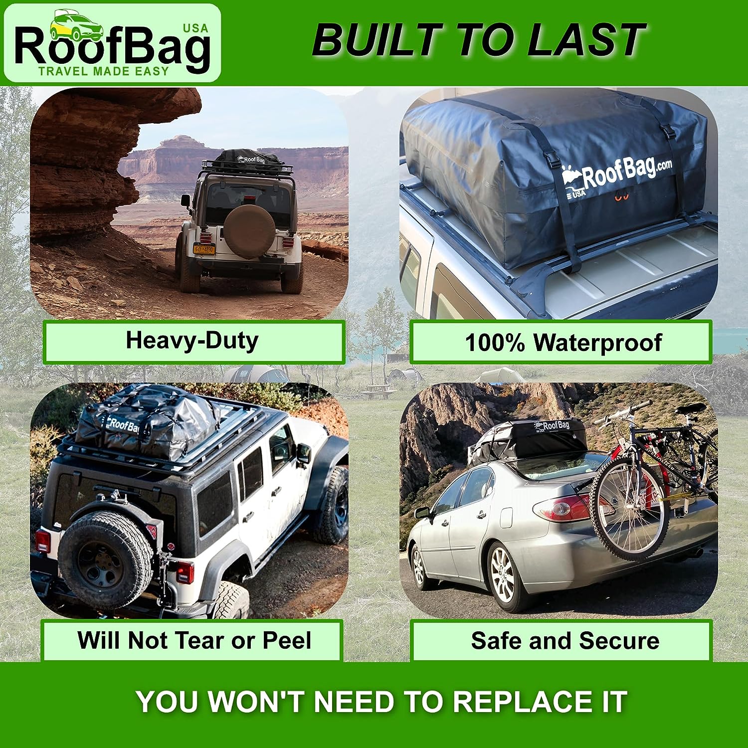 • HEAVY-DUTY: Not only is the RoofBag car topper luggage carrier waterproof, but it is also extremely sturdy. 18 years of improvements led to a roof bag cargo carrier made to last: military-grade fabric that will not peel or tear, is resistant to cold, heat, and UV, and best of all, is free of harmful chemicals, so that you can safely use it for baby clothes. Customer satisfaction is ensured by experienced US staff and by a 2-year warranty. Tip: fill bag completely to avoid wind-flapping damage
