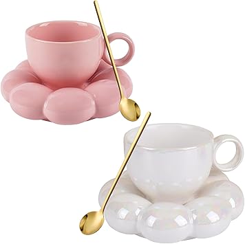 2Pieces Ceramic Cloud Mug Cute Cup with Sunflower Coaster 10oz Novelty Ceramic Coffee Mug with Saucer Set for Home Office Coffee Tea Latte Milk-Pink and Pearl White