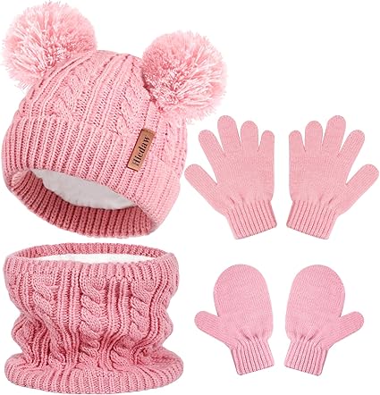 Hicdaw Kids Winter Hats Gloves Scarf Set Kids Mittens Double Pompom Cap Fleece Lined Toddler Beanie Hat for Boy Girl