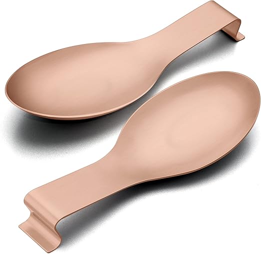 Spoon Rest Set of 2, E-far Stainless Steel Rose Gold Spoon Ladle Holder, Metal Copper Spatula Rest for Kitchen Stove Top, Large Size & Dishwasher Safe