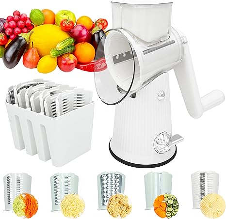 Rotary Cheese Grater, Multifunctional 5 in 1 Cheese Grater with Handle, Kicthen Mandoline Vegetable Slicer with Suction Base, Replaceable Stainless Blades Cheese Shredder for Fruits, White