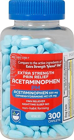 Rite Aid Extra Strength Pain Relief Acetaminophen PM Caplets, 500mg Acetaminophen / 25mg Diphenhydramine - 300 Count - Nighttime Pain Reliever + Sleep Aid