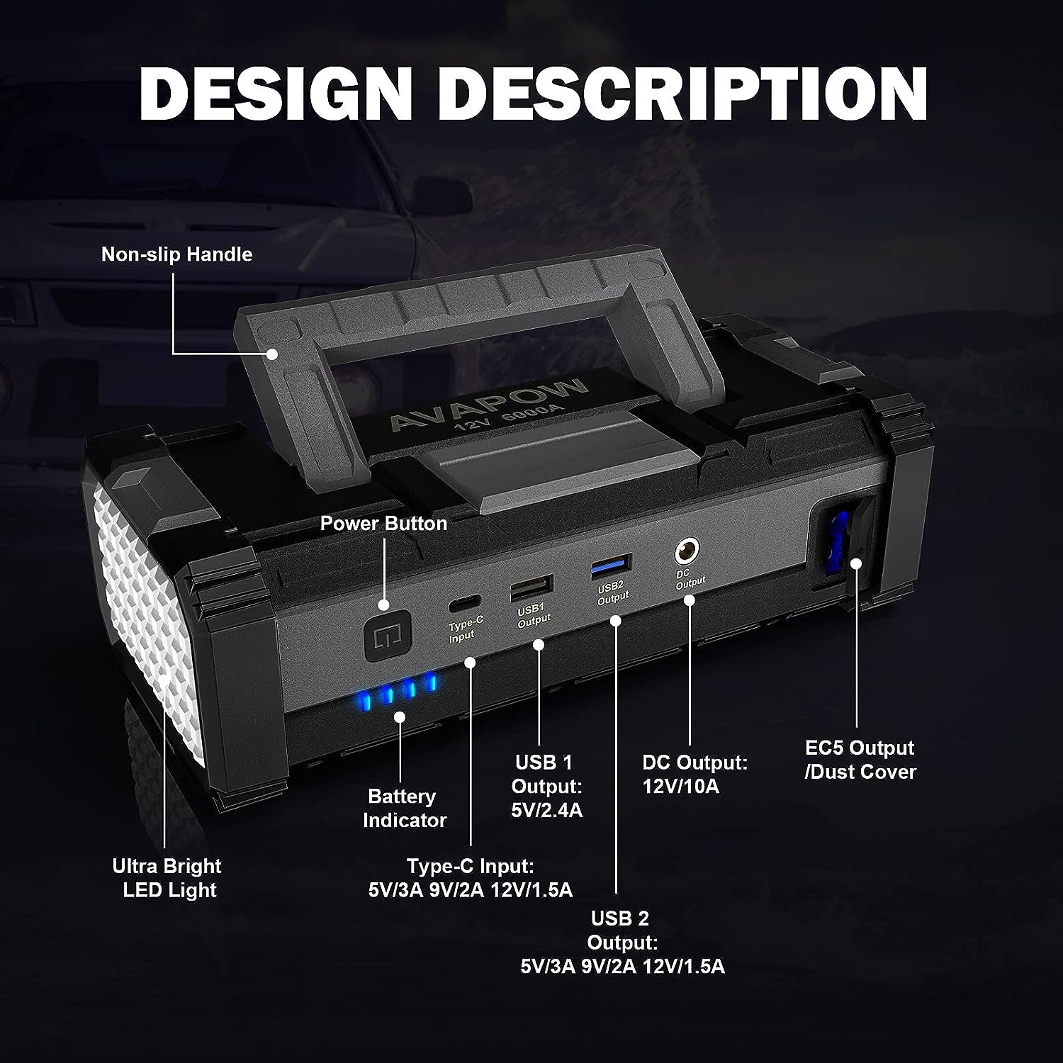 AVAPOW 6000A Car Battery Jump Starter(for All Gas or up to 12L Diesel) 2023 Upgraded Powerful Car Jump Starter with Dual USB Quick Charge and DC Output,12V Jump Pack with Built-in LED Bright Light