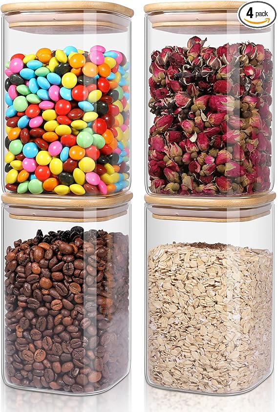 4 Pack Glass Storage Containers with Lids, Clear Food Jars Fits for Pantry, Coffee Bar, Square Airtight Canisters for Organizer Pasta, Sugar, Cerea, Coffee Bean