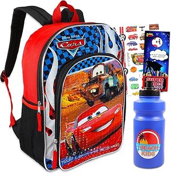 Disney Cars Backpack for Kids - 16" Cars Backpack Featuring Lightning McQueen and Mater, Water Bottle, Disney Cars Tattoos, and Beach Kids Superhero Door Hanger (Cars Backpack for Toddlers)