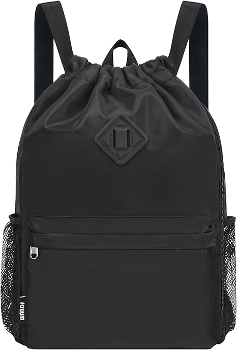 WANDF Drawstring Backpack Sports Gym Bag with Shoes Compartment, Water-Resistant String Backpack Cinch for Women Men (Large, Black)