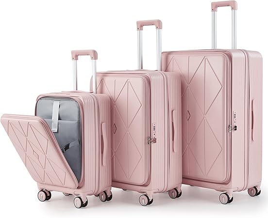 Luggage 3 Piece Sets, Front Open Hardshell Luggage Sets with PVC Cover, Expandable Carry On Suitcase Set with TSA Lock & Double Wheels, PC Lightweight 20in/24in/28in Luggage, Pink
