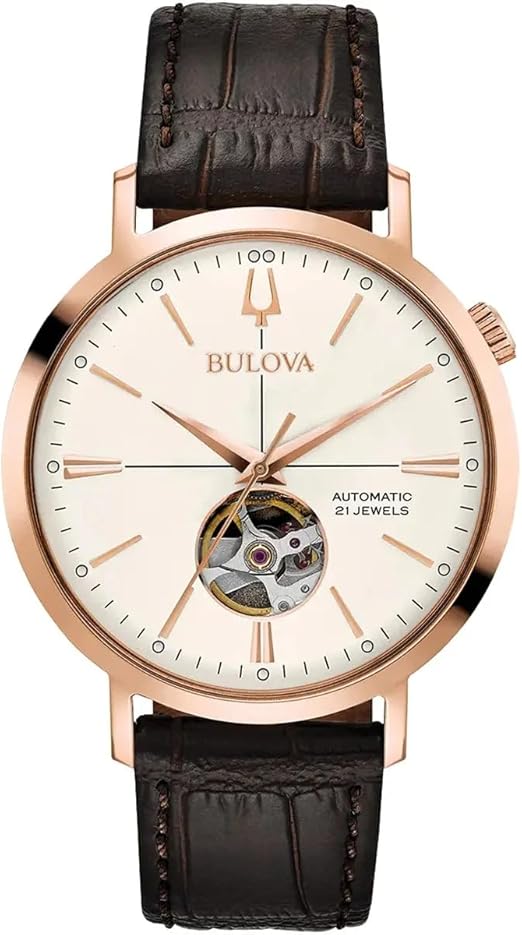 Bulova Men's Classic Aerojet 3-Hand Automatic Leather Strap Watch, Open Aperture, 40-Hour Power Reserve, Double Curved Mineral Crystal, 41mm