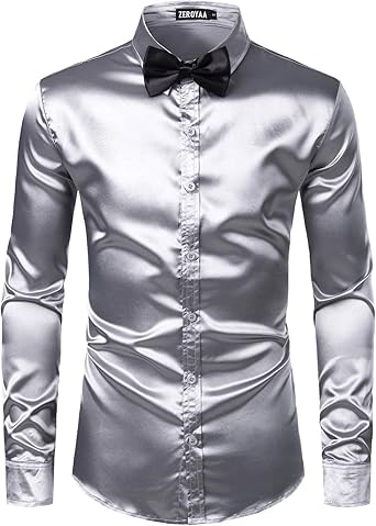 ZEROYAA Men's Luxury Shiny Silk Like Satin Button Up Dress Shirts