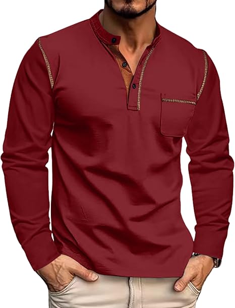 Mens Henley Shirts Long Sleeve Crewneck Front Pocket Patchwork Half Button Slim Fit Lightweight Casual Pullover Tees