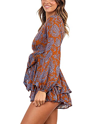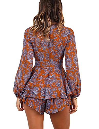 AIMCOO Women's Floral Print Deep V-Neck Romper Double Layer Ruffle Hem Jumpsuits Long Baggy Sleeves Waist Tie Short Rompers