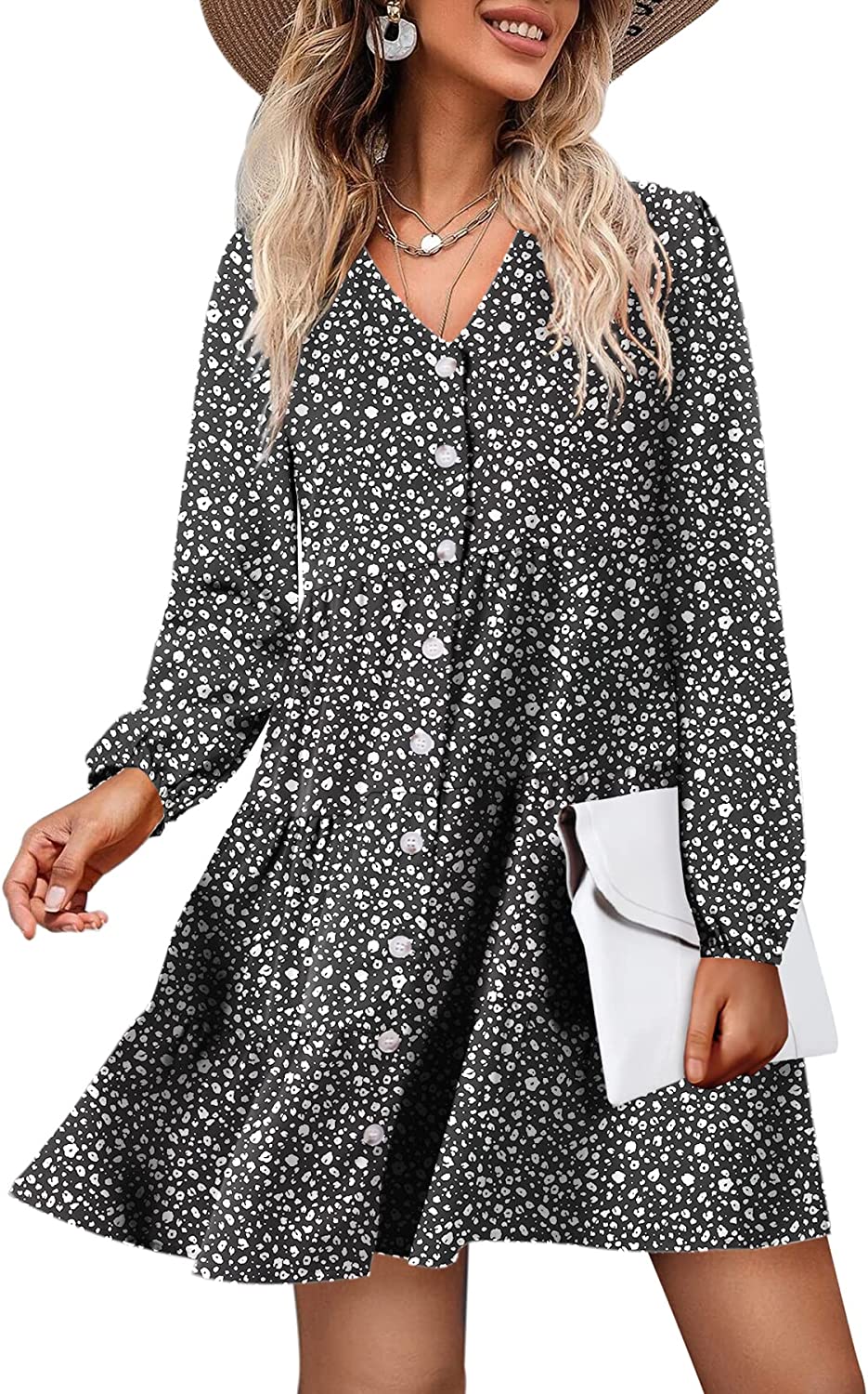 Details: Amoretu Women V Neck Button Up Ruffles Hem Short Sleeve Loose Swing Dress1. This V-neck button casual dress with soft anti-wrinkle fabric, very breathable and super comfortable.2. Women summer dress with exquisite tailoring, micro-pleated hem, solid color, simple but also stylish, trendy and sexy.3. Above the knee length, nice to wear to work, business, office, or for travel, holiday, school, even night out, party, club.4. Simple versatile style, perfectly match with leggings, boots, jackets, windbreakers in casual or formal occasions.5. Summer essentials. Best layering for Spring, Fall and Winter.