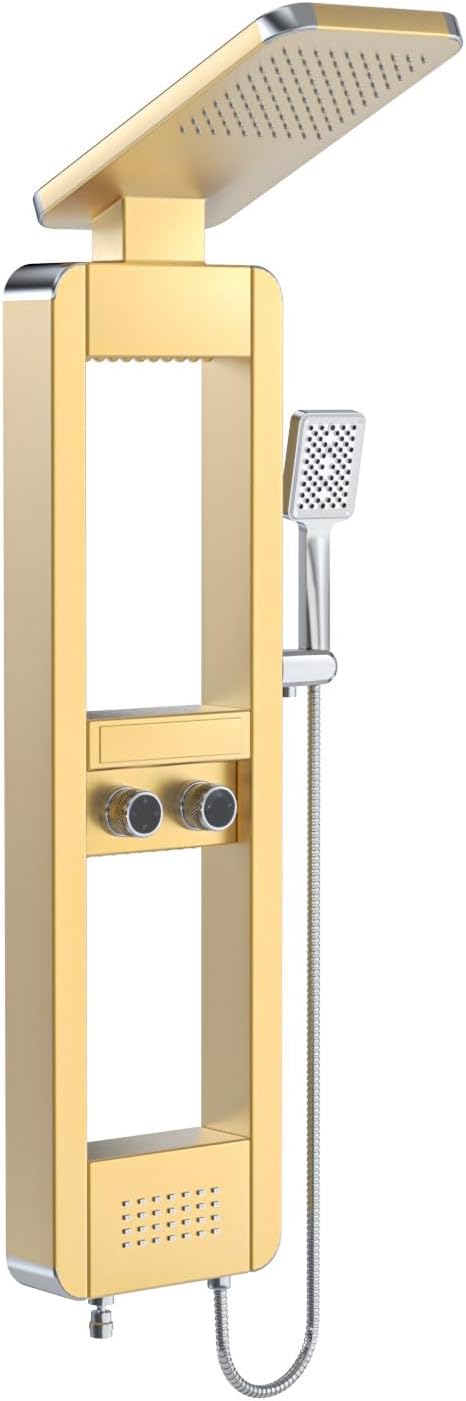 ELLO&ALLO Shower Panel Tower System with Shelf, Rainfall Shower Head and Rain Massage System with Body Jets, Stainless Steel Bathroom Fixtures, Brushed Gold&Chrome