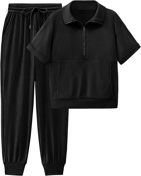 BTFBM Women's Summer 2 Piece Outfits Short Sleeve Half Zip Sweatshirt Jogger Sweatpants Sets Lounge Sweatsuits Tracksuit