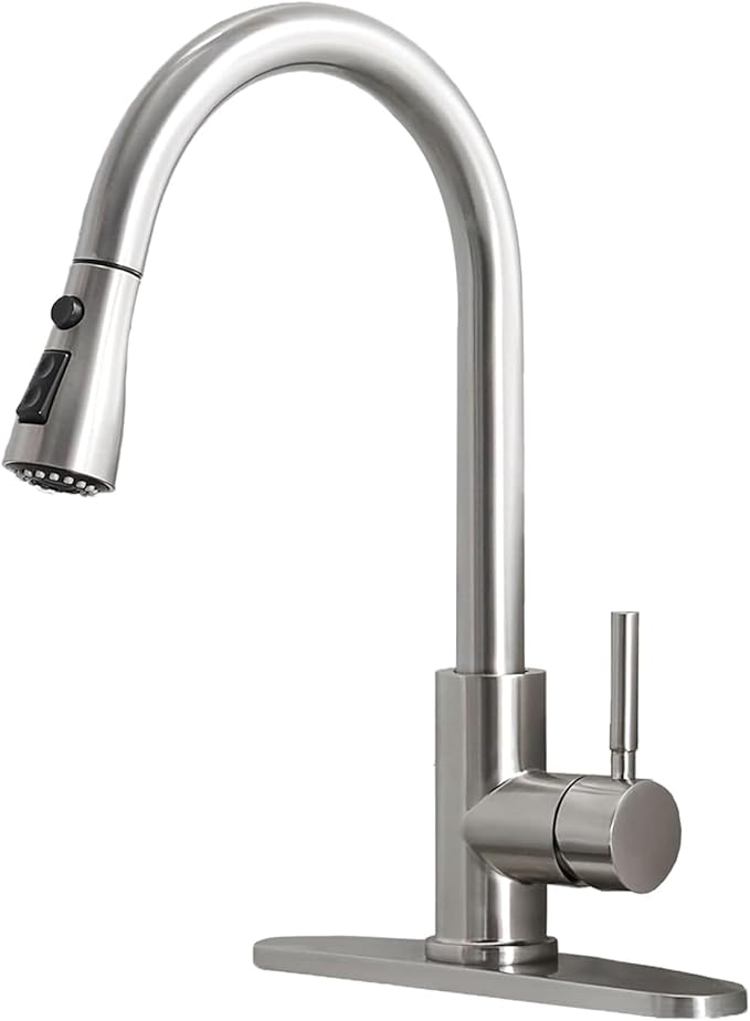 High Arc Single Handle Brushed Nickel Kitchen Faucet with Pull Down Sprayer, Stainless Steel Kitchen Sink Faucet with Deck Plate 1 Hole Or 3 Hole Pull Out Faucet for Bar Laundry RV