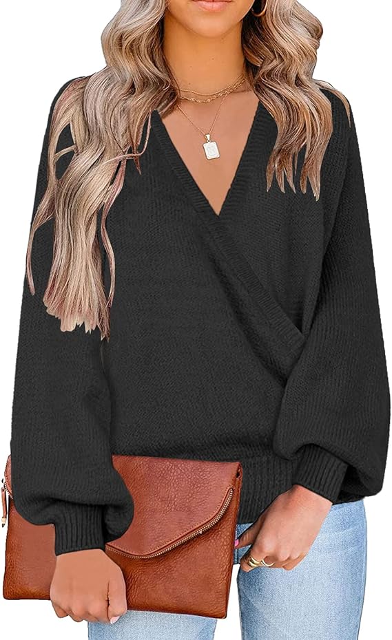 LookbookStore Women's Knit Long Sleeve Faux Wrap Surplice V Neck Sweater Top