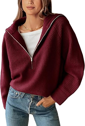 BTFBM Women___s Casual Long Sleeve Half Zip Pullover Sweaters Solid V Neck Collar Ribbed Knitted Loose Slouchy Jumper Tops