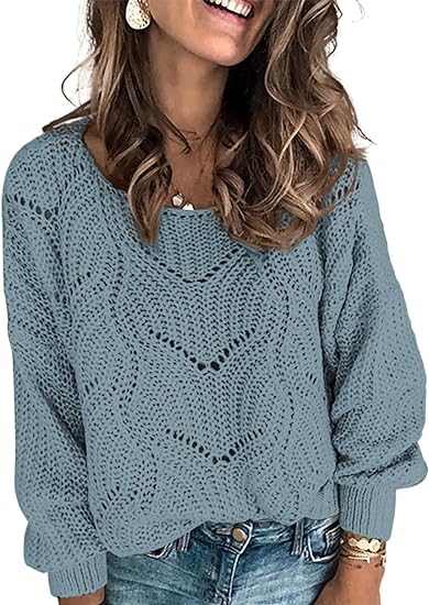 Dokotoo Womens Sweaters 2024 Cute Elegant Soft Crewneck Long Sleeve Hollow Cable Knit Pullover Tops