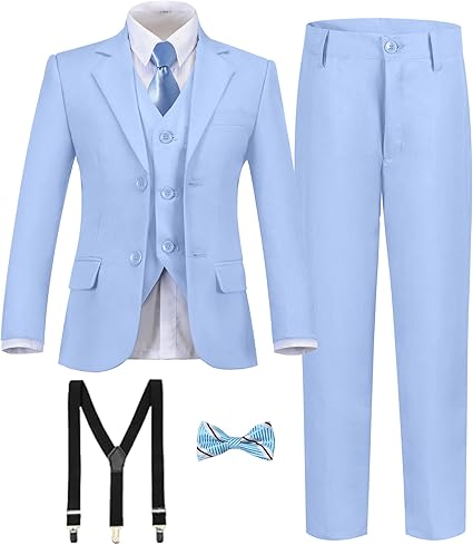 Boy's Formal Suit 7 Piece Slim Fit Tuxedo for Kids Teen Boys Jacket Vest and Pants Set for Wedding with Bow Tie Suspenders