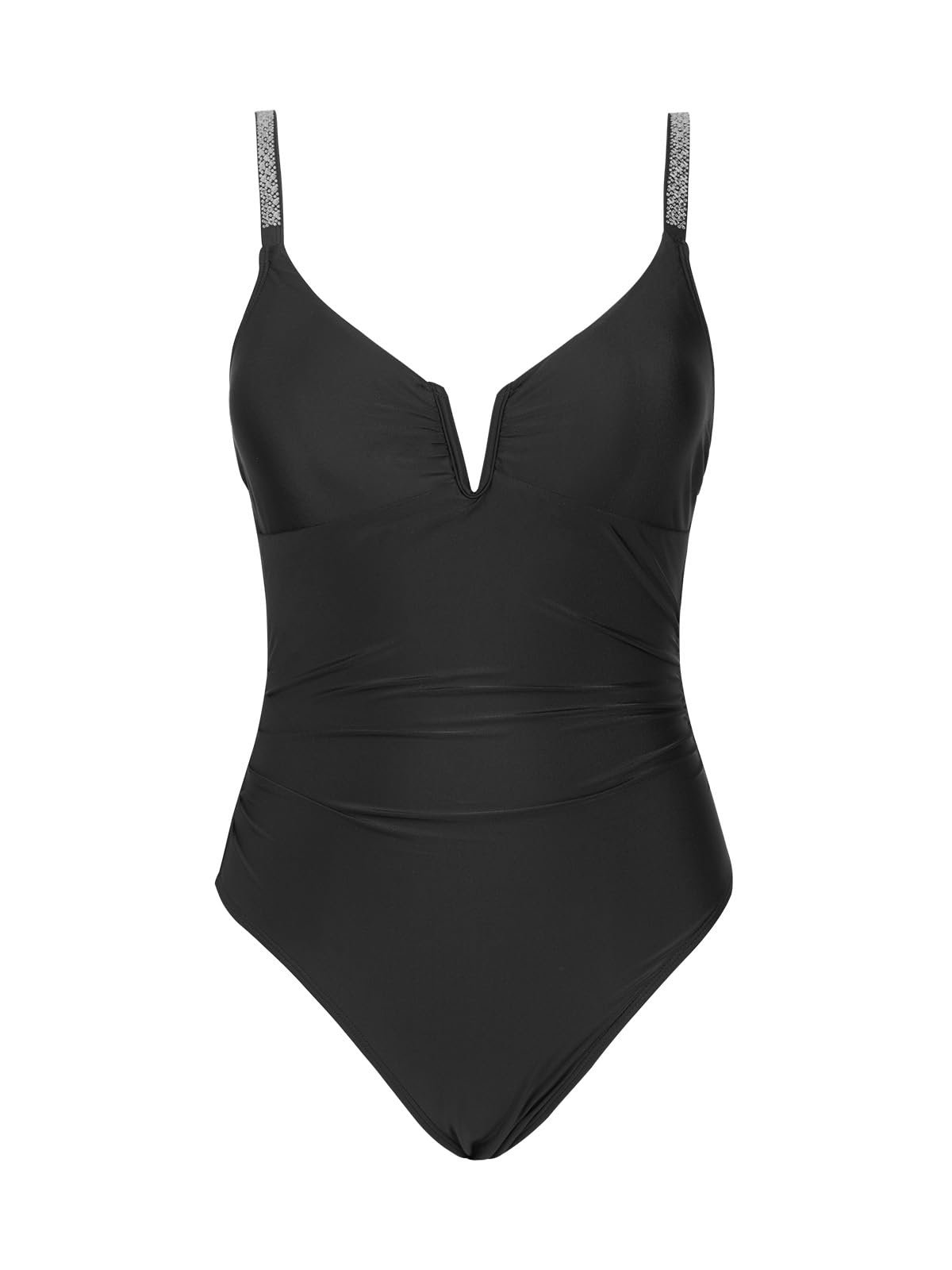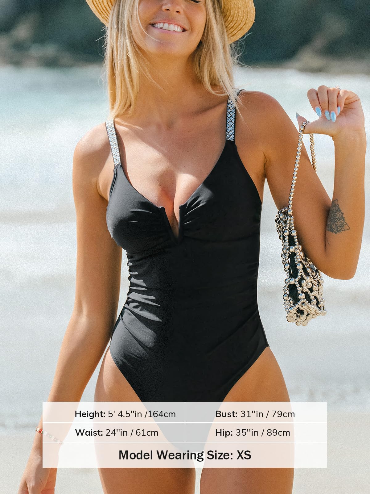 CUPSHE Women's One Piece Swimsuit Tummy Control V Wire Neck Bathing Suit Ruched High Cut Adjustable Straps, M Black