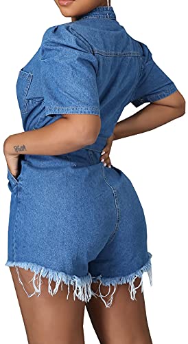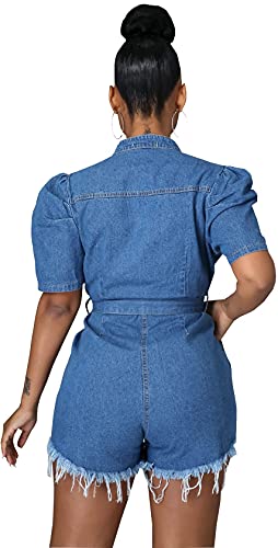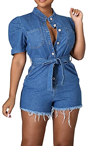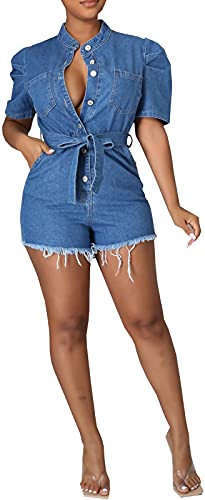 Denim Rompers for Women Sexy Short Sleeve Plus Size Jeans Bodycon Short Jumpsuits with Belt Pockets Botton Down