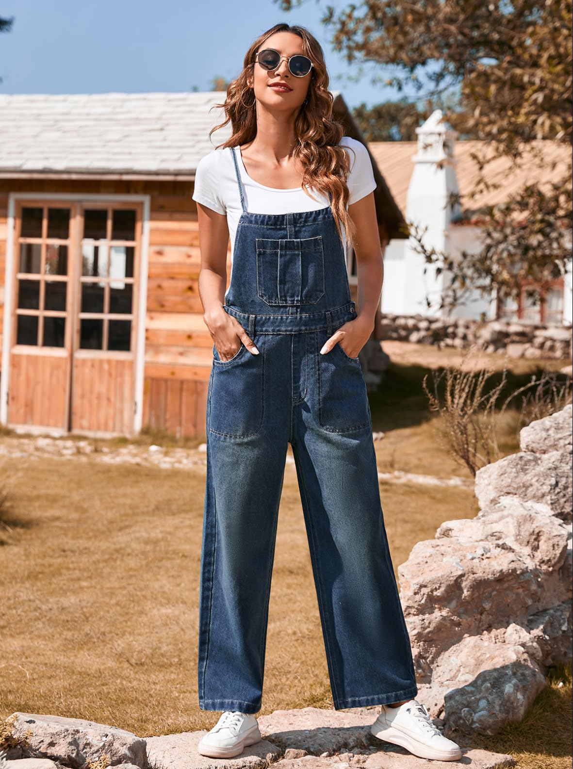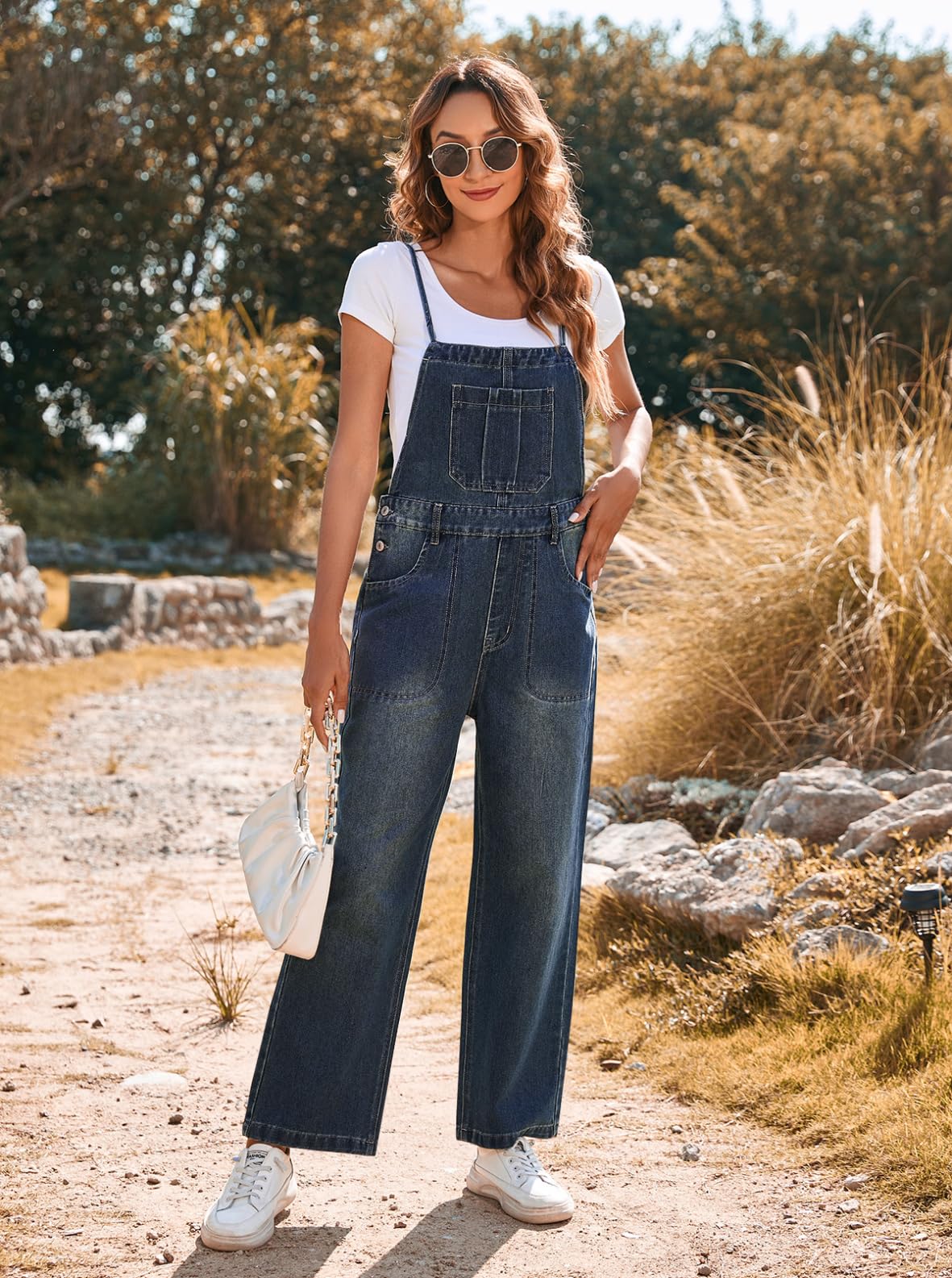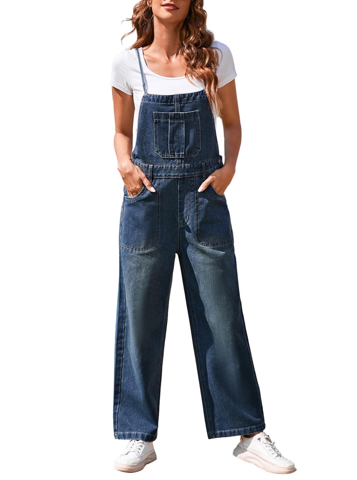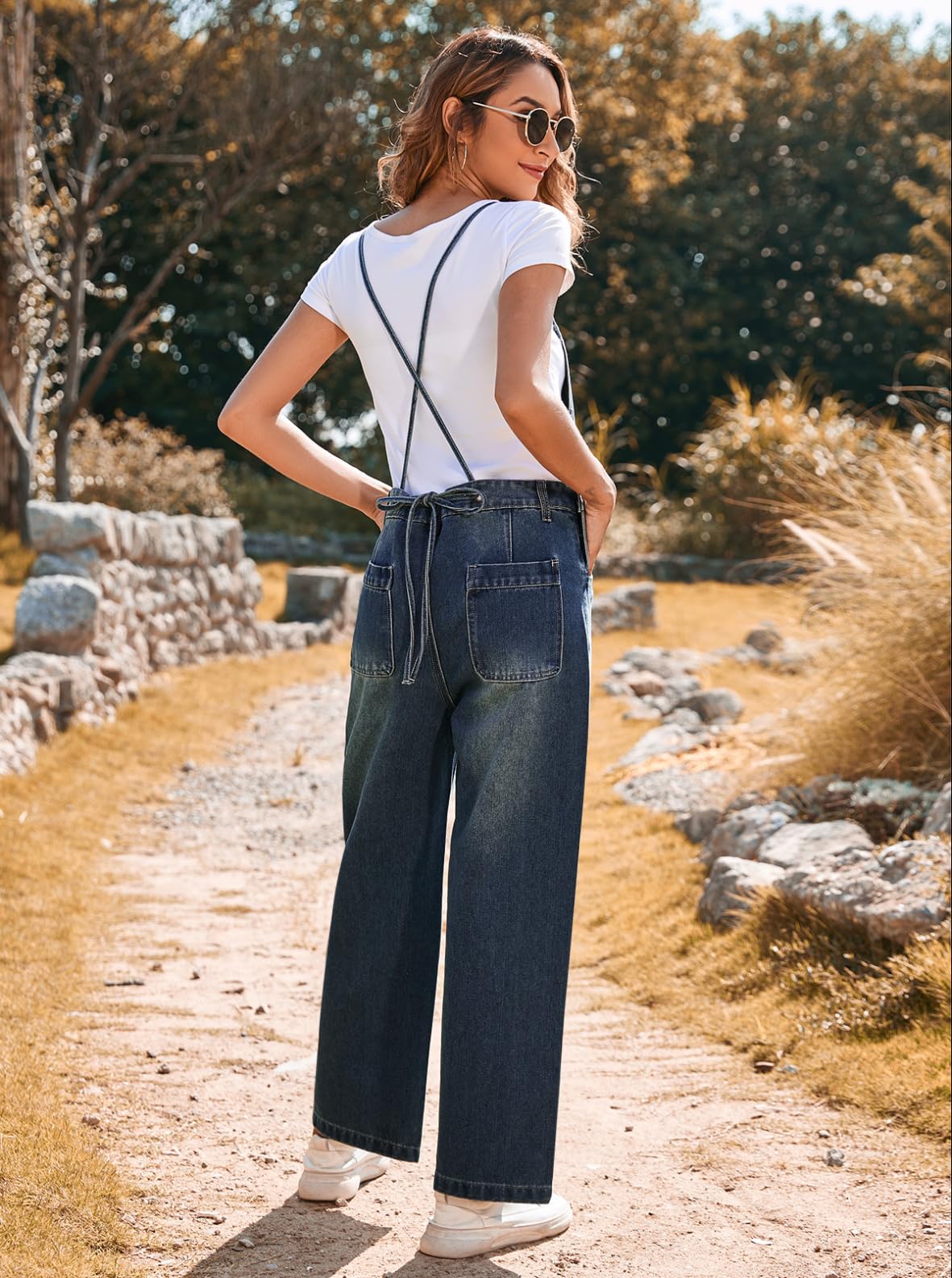 Details: Pink Queen Women's Denim Bib Overalls Casual Loose Adjustable Straps Wide Legs High Waist Jean Pants Jumpsuits with Pockets