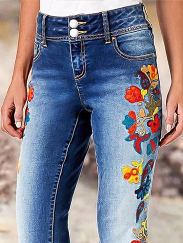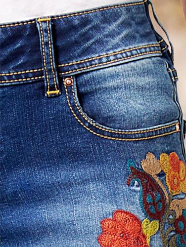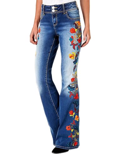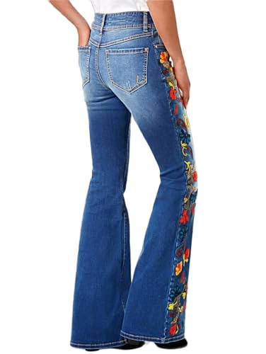 Flamingals Women's Floral Embroidery Side Flare Jeans Mid Waist Casual Jeans Navy Blue L